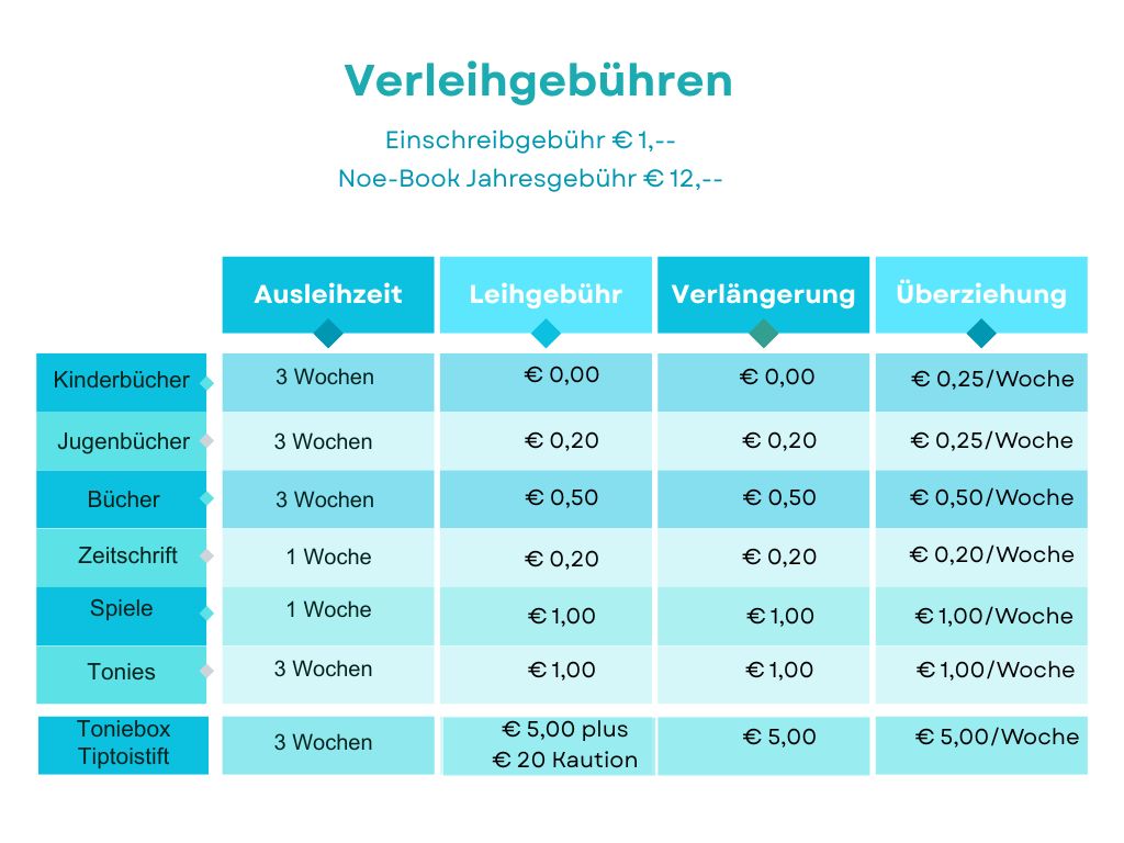 Die Entlehnfrist beträgt 3 Wochen für Bücher, Hörbücher, Tonies und Tonieboxen und 1 Woche für DVD’s, Spiele und Zeitschriften. Wird diese Frist überschritten ist eine Säumnisgebühr zu entrichten. Die Entlehnfrist kann in Abstimmung mit dem Büchereiteam persönlich oder telefonisch verlängert werden.